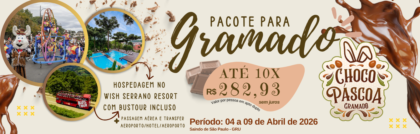 Período: 04 a 09 de Abril de 2026. Incluso voo + hotel com café + transfer + bustour + chocobus + noite de fondue. Em até 10x R$ 298,52 por pessoa em apto duplo. Saída de São Paulo.