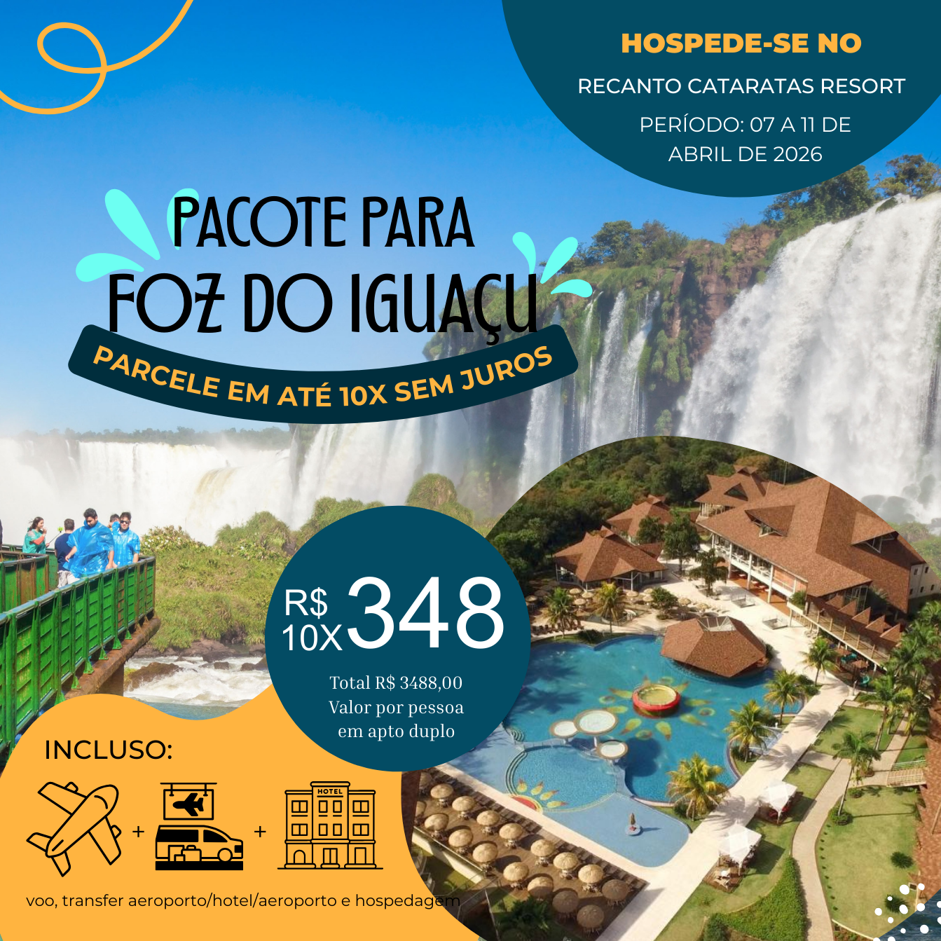 Período: 07 a 11 de abril de 2026. Incluso hotel com café e transfer. Aéreo pode ser adicionado sob consulta. Parcelamento em 10x R$ 569,00 por pessoa em apartamento duplo.
